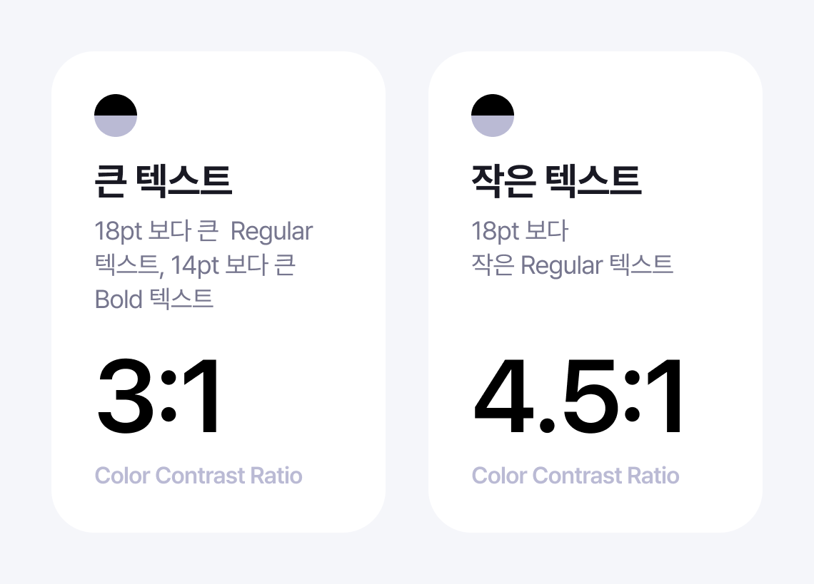 명도 대비는 텍스트와 배경 또는 인터페이스 컴포넌트 간의 색상 차이를 의미하며, 이를 통해 콘텐츠가 보다 쉽게 인식될 수 있도록 해야 합니다. WCAG 가이드라인에서는 명도 대비 비율을 최소한 4.5:1 이상 유지할 것을 권장하며, 큰 텍스트(18pt 이상) 또는 굵은 텍스트(14pt 이상)는 3:1의 비율을 유지하도록 규정하고 있습니다. 명도 대비가 부족하면 저시력 사용자나 시각 장애인은 콘텐츠를 인식하는 데 어려움을 겪게 됩니다. WCAG 2.2 Quick Reference - Contrast (Minimum)
