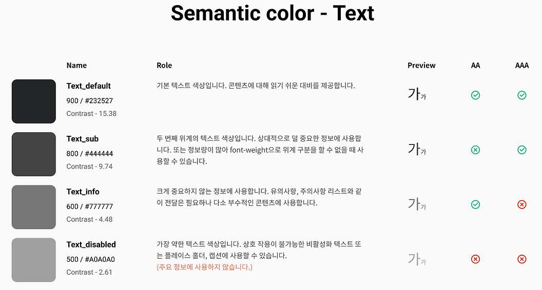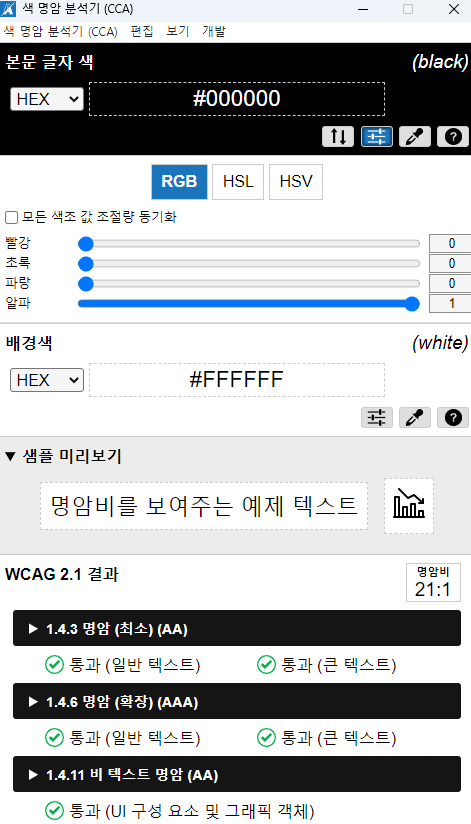 위 사이트는 WCAG(Web Content Accessibility Guidelines)의 AA, AAA 기준으로 Small text, Large text, UI components에 따라서 Pass 또는 Fail을 표시해준다. WCAG Color Contrast CheckerWCAG Color Contrast Checker 사이트