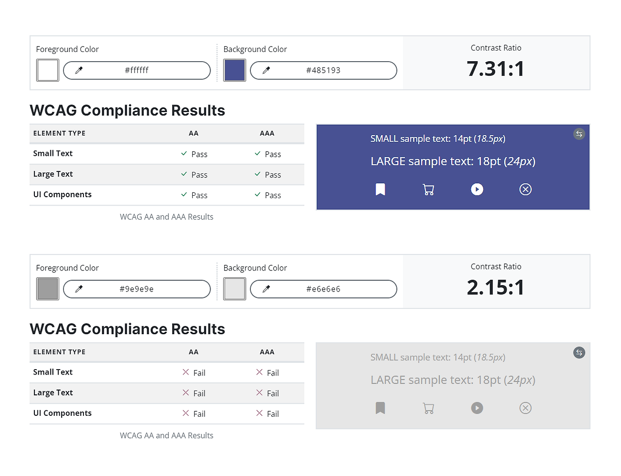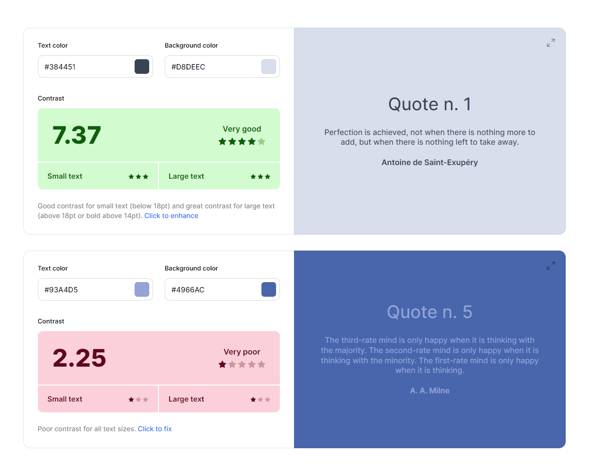 배경색과 텍스트 색상을 지정하여 작은 텍스트와 큰 텍스트의 명암비를 파악할 수 있다. 값의 상태에 따라 Poor, Good, Super와 같은 상태 표시로 적절한 대비 상태를 직관적으로 인지할 수 있다. Color Contrast CheckerColor Contrast Checker 사이트