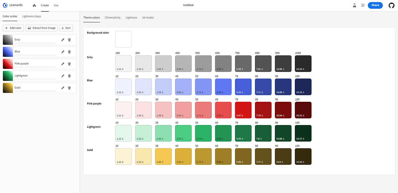 한 번에 여러 개의 색상을 체크하거나 색상 팔레트의 명암비를 체크하고 싶을 때 유용하다. 여러 가지 색상을 추가할 수 있으며 색상 대비를 조정하거나 밝기를 조정해서 팔레트를 구성할 수 있다. 우측에 표시되는 팔레트에는 배경 색상 대비 명암비가 자동으로 표시된다. 배경 색상을 변경하면 명암비도 자동으로 변경된다. LeonardoLeonardo 사이트
