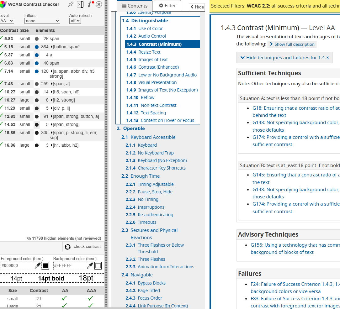 현재 운영 중인 사이트의 명암비를 체크할 수 있는 플러그인이다. 플러그인을 설치하고 실행하면 좌측 패널에서 현재 보고 있는 페이지의 각 콘텐츠 명암비를 체크해준다. 사이즈도 Small, Large로 자동으로 보여주며 요소를 클릭하면 해당 위치로 자동 스크롤 되어 확인할 수 있다. WCAG Color contrast checkerWCAG Color contrast checker 확장 프로그램