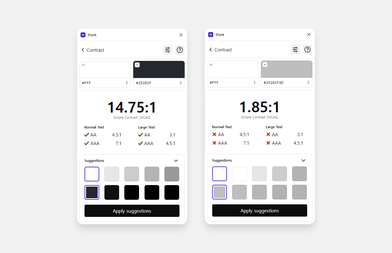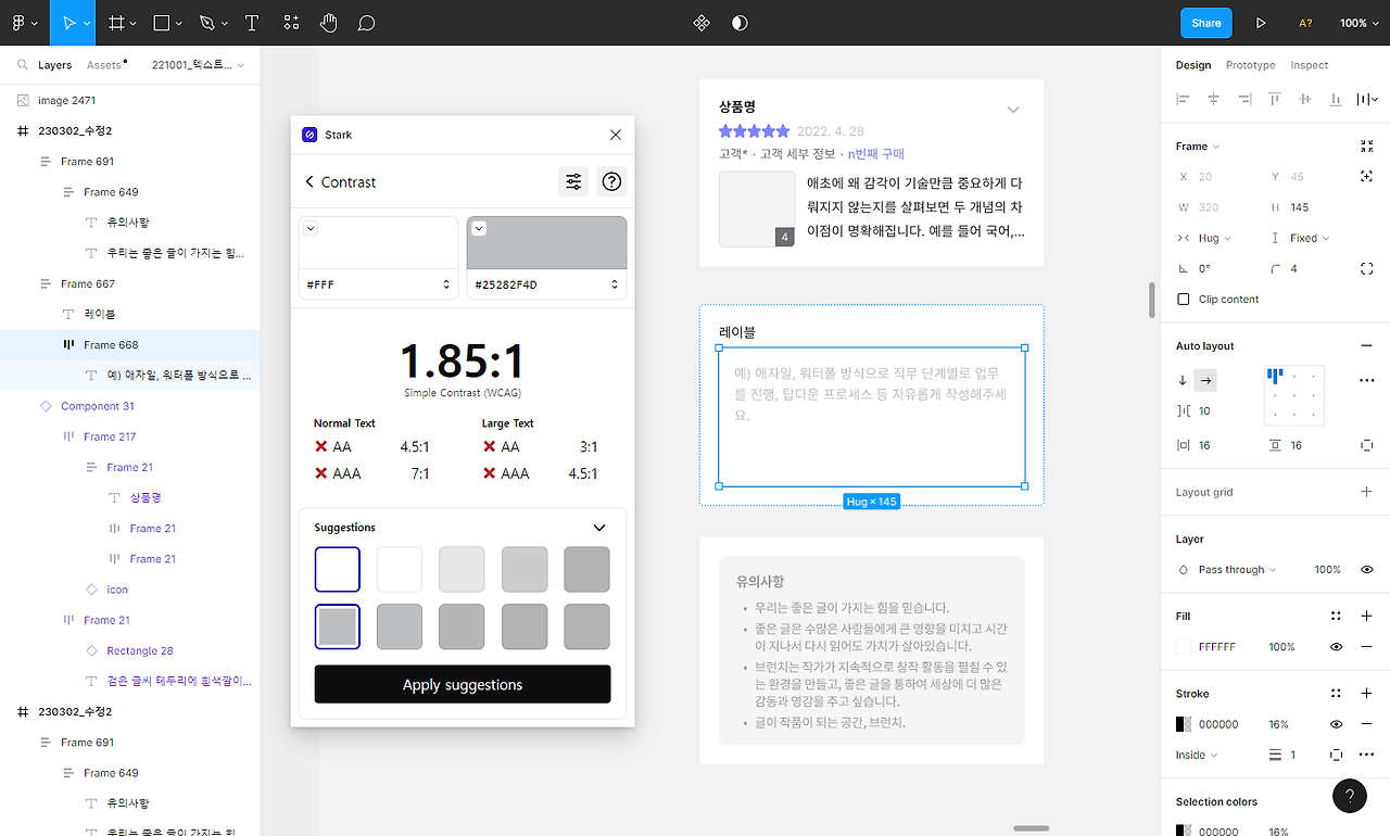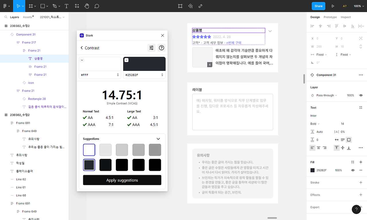 해당 플러그인을 사용하면 피그마 내에서 선택한 디자인의 명암비를 바로 확인할 수 있다. 웹접근성 지침(AA, AAA)의 기준에 따라 표시도 해주며, 제안 색상을 선택하면 일괄적으로 별경할 수도 있다. 변경은 Pro 버전이라서 그냥 확인하는 용도로도 충분히 사용성이 좋은 것 같다. Figma : Stark - Contrast & Accessibility Checker피그마 플러그인 Contrast & Accessibility Checker