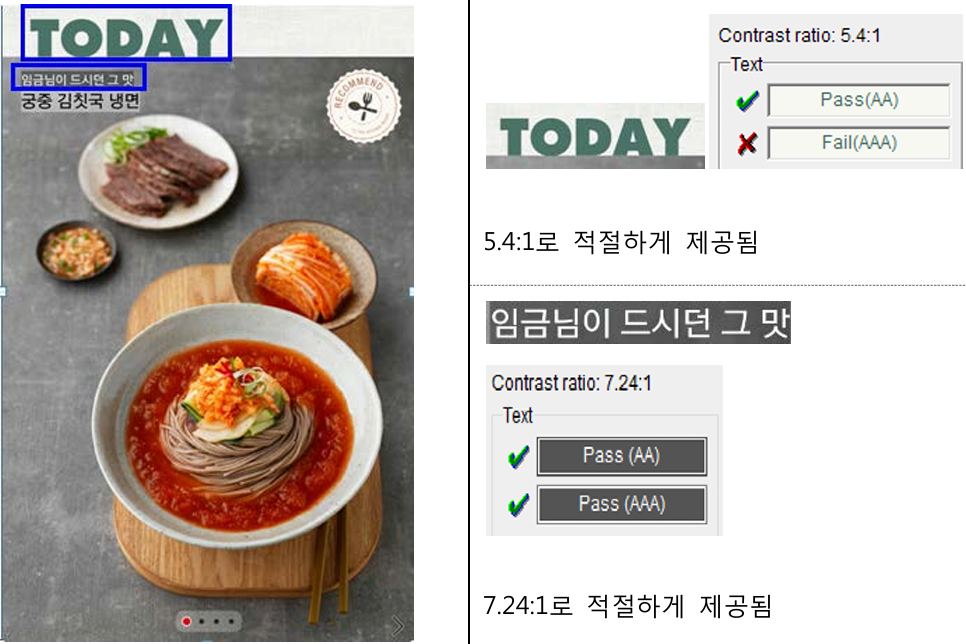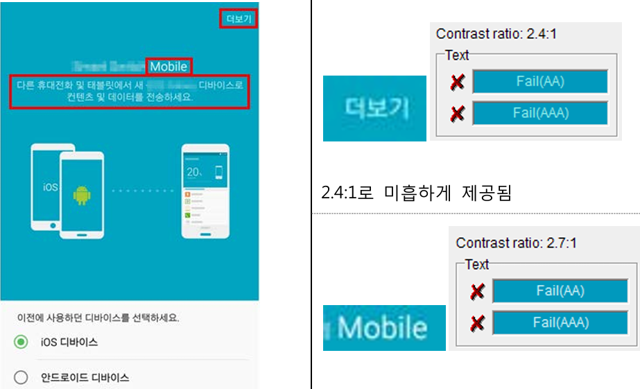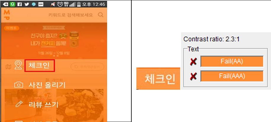 관련 지침 : 화면에 표시되는 모든 사용자 인터페이스 컴포넌트와 텍스트는 전경색과 배경색이 구분될 수 있도록 제공되어야 한다.